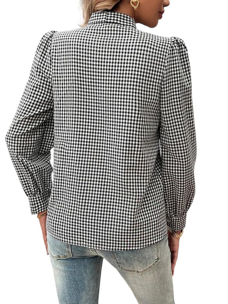 Camicia alla moda100% poliestere camicetta elegante da donna con collo a papillon e maniche lunghe, camicie casual con collo a papillon e bottoni